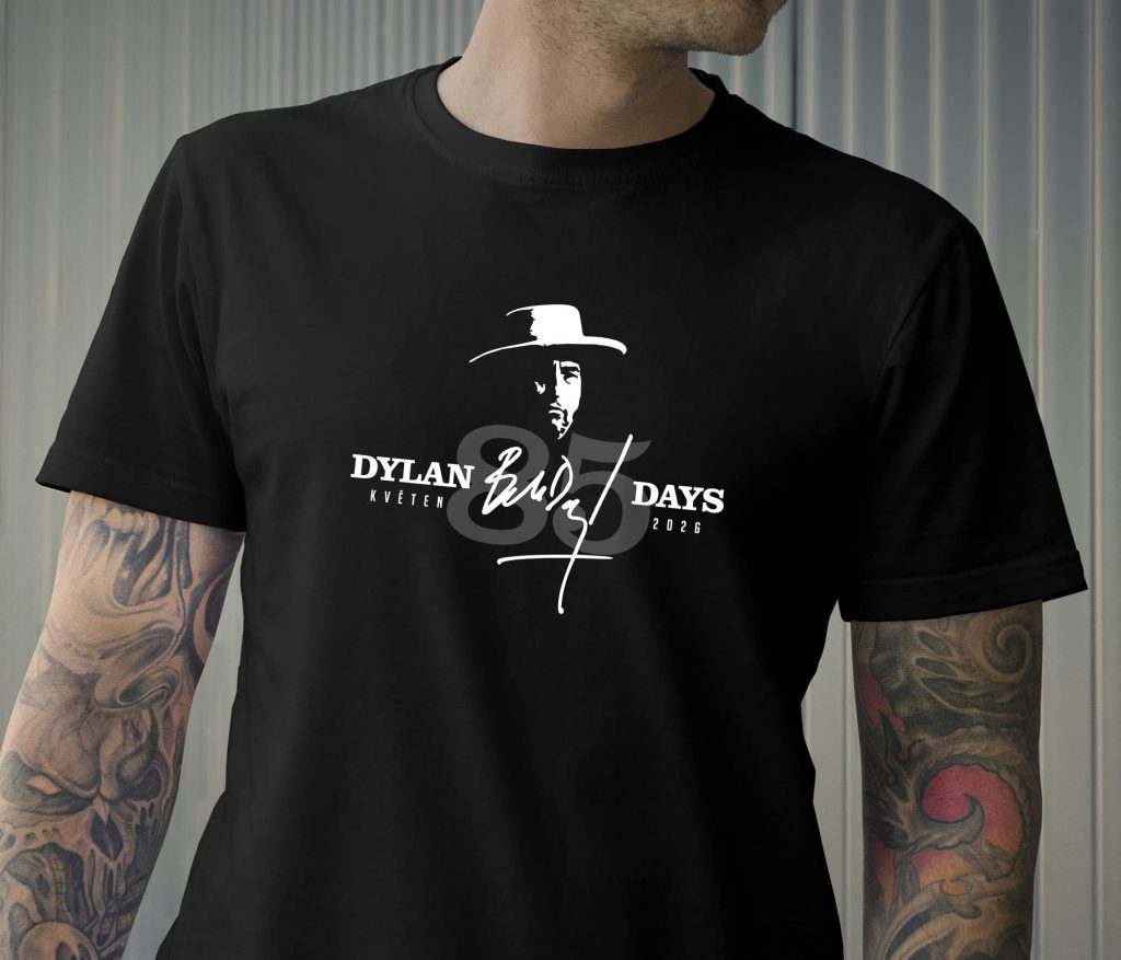 Pokud byste měli zájem o tričko s logem letošních Dylan Days, je možné si ho objednat, napište nám velikost. Cena by se navzdory inflaci měla pohybovat mezi dvěstěpadesáti a třemi stovkami.